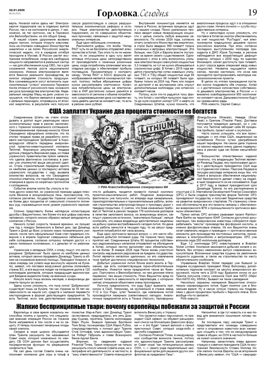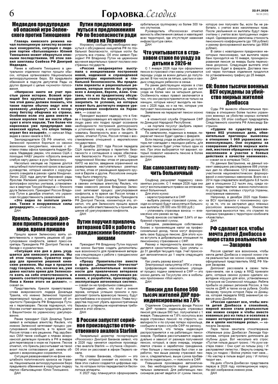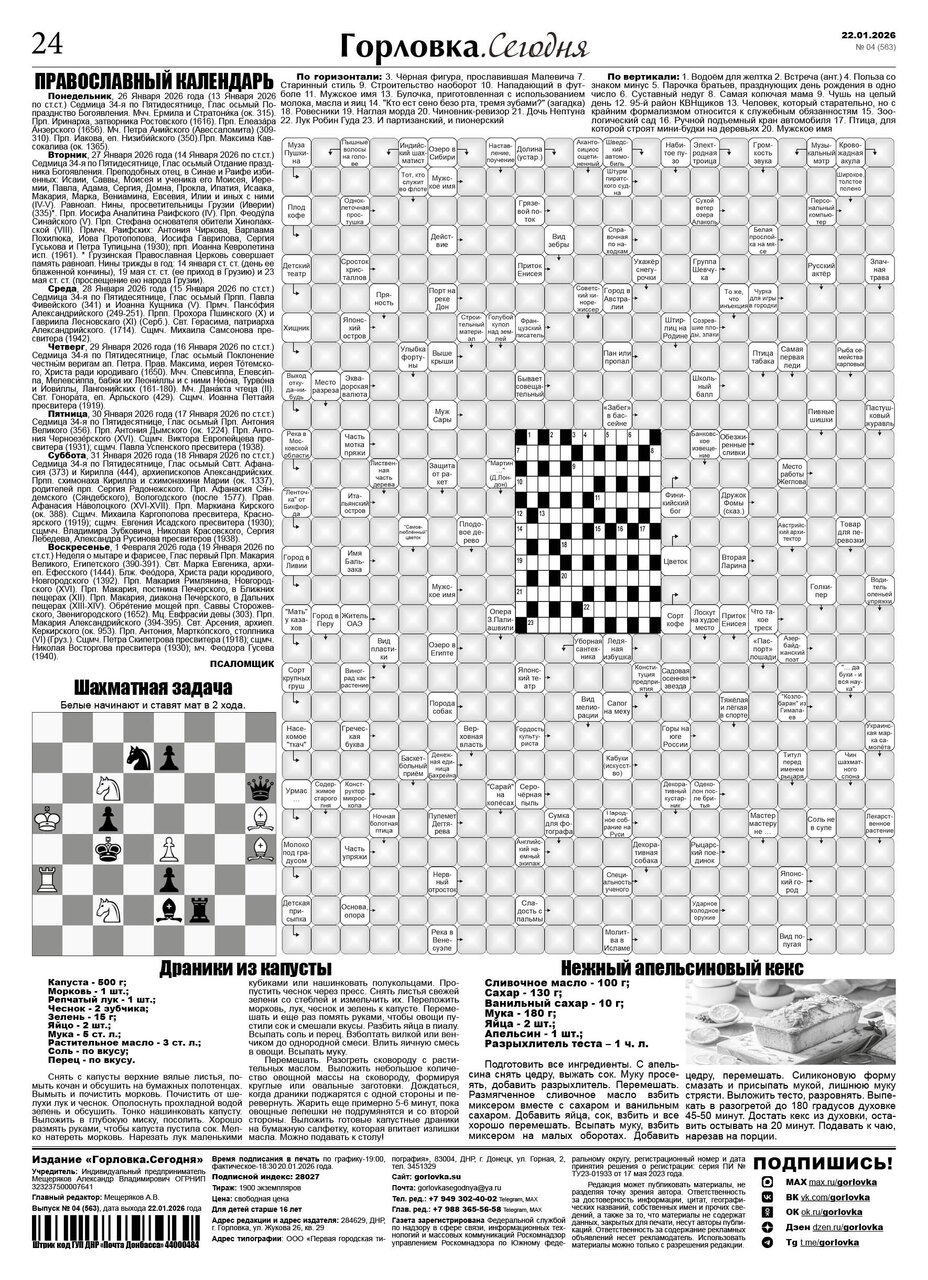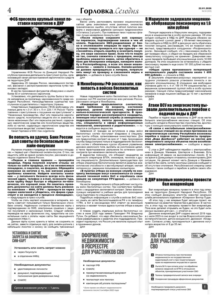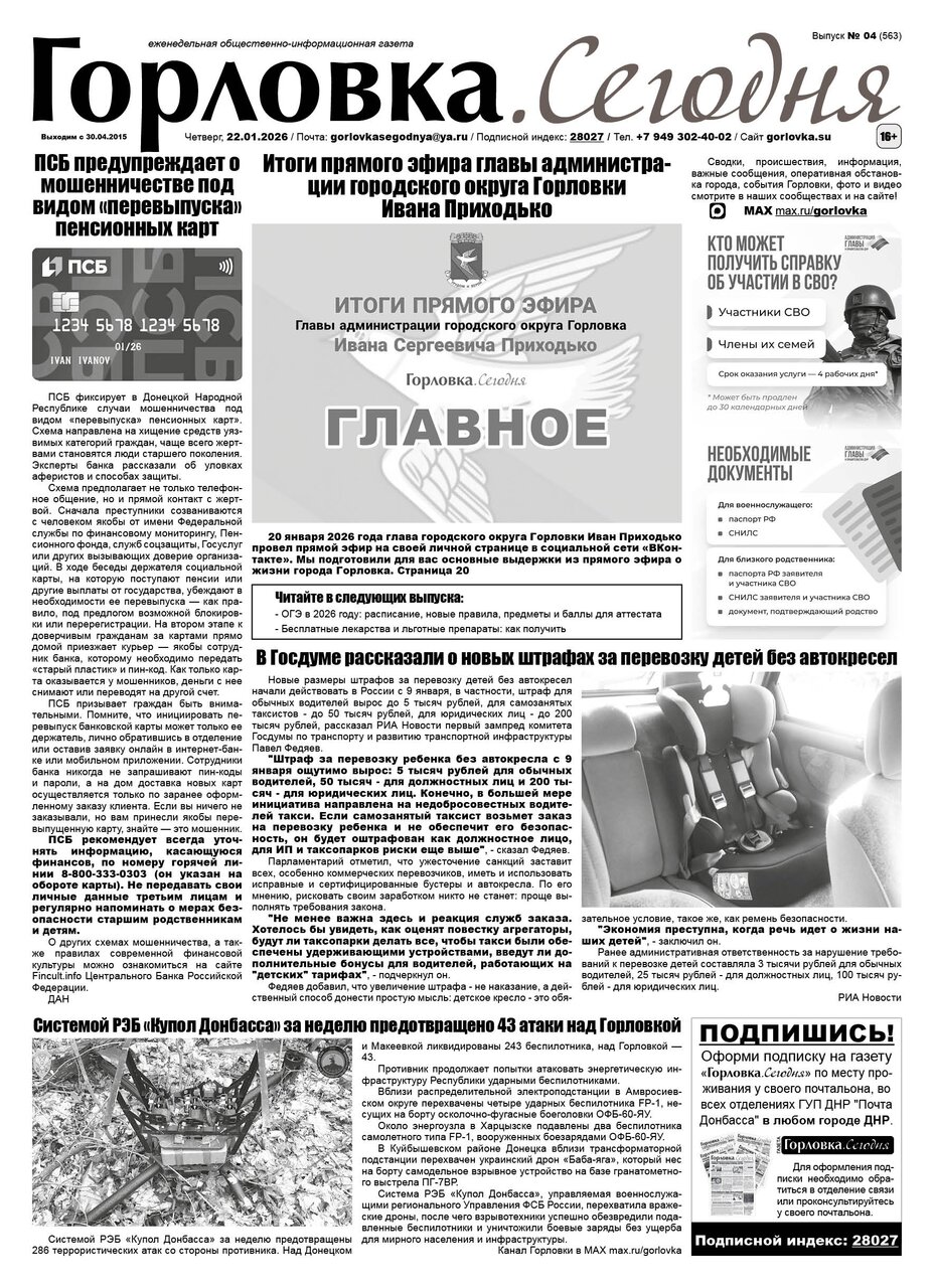 🗞 22 января 2026 года, вышел новый выпуск общественно-информационной газеты «Горловка.Сегодня» 🇷🇺 №04 (563). 24 полосы, тираж 1900 экз., газета выходит каждый четверг. 📰 https://t.me/gorlovka