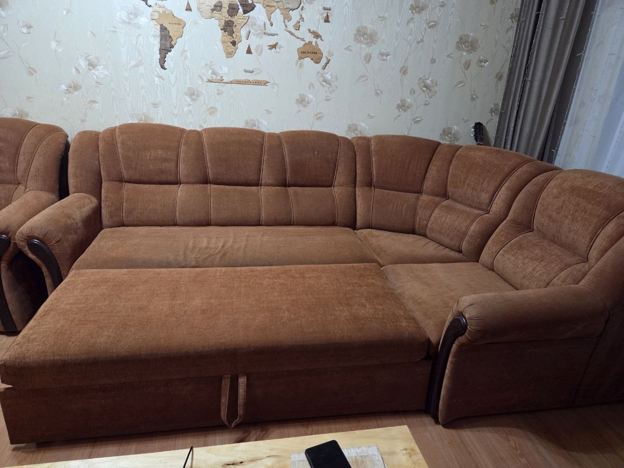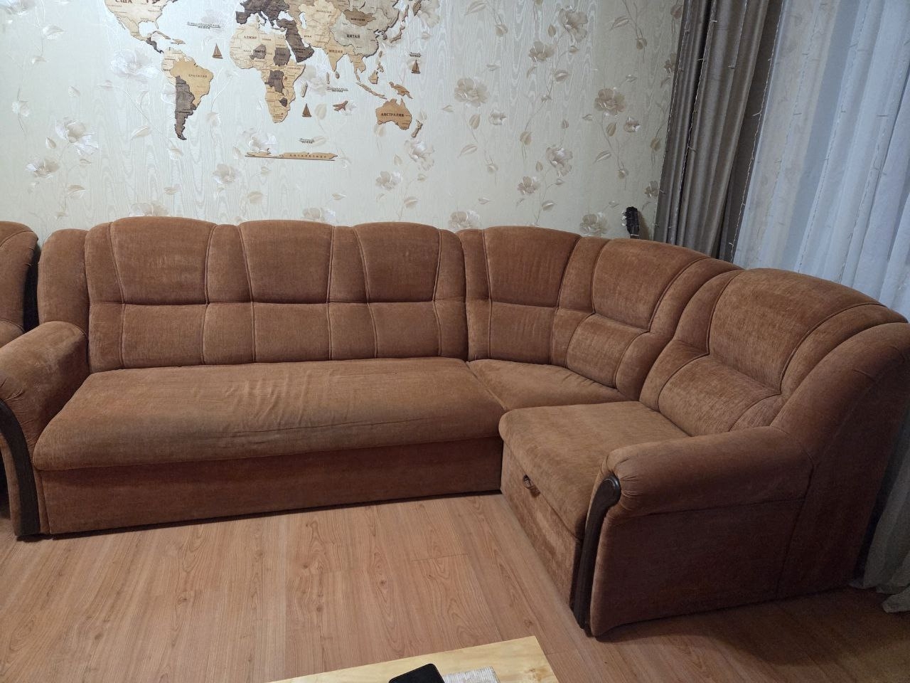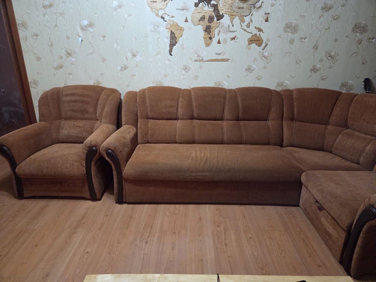 Диван угловой 260*180(общий размер) спальное место 200*120 . Есть небольшие нюансы ,потёртости ,цена 15 000р ,кресло в комплекте ,пледы в подарок. Самовывоз. Мирный Донецк .тел +79493990374 Дмитрий