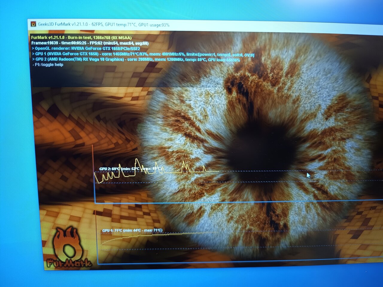 📌Видеокарта дискретная: NVIDIA GeForce GTX 1650- мощная карта с 4 Гб своей видеопамяти, 67-69 Fps в стресс-тесте Furmark, в cтандартном HD разрешении.