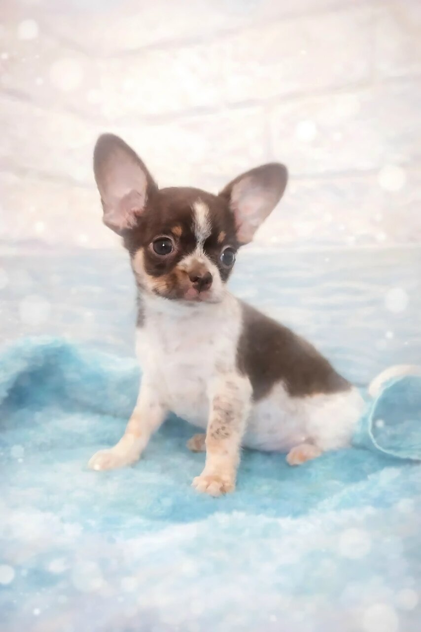 В продаже мальчик породы чихуахуа -Kapuchino к/ш в размере стандарт,в окраске: шоколадный триколор в шоколадный крап.