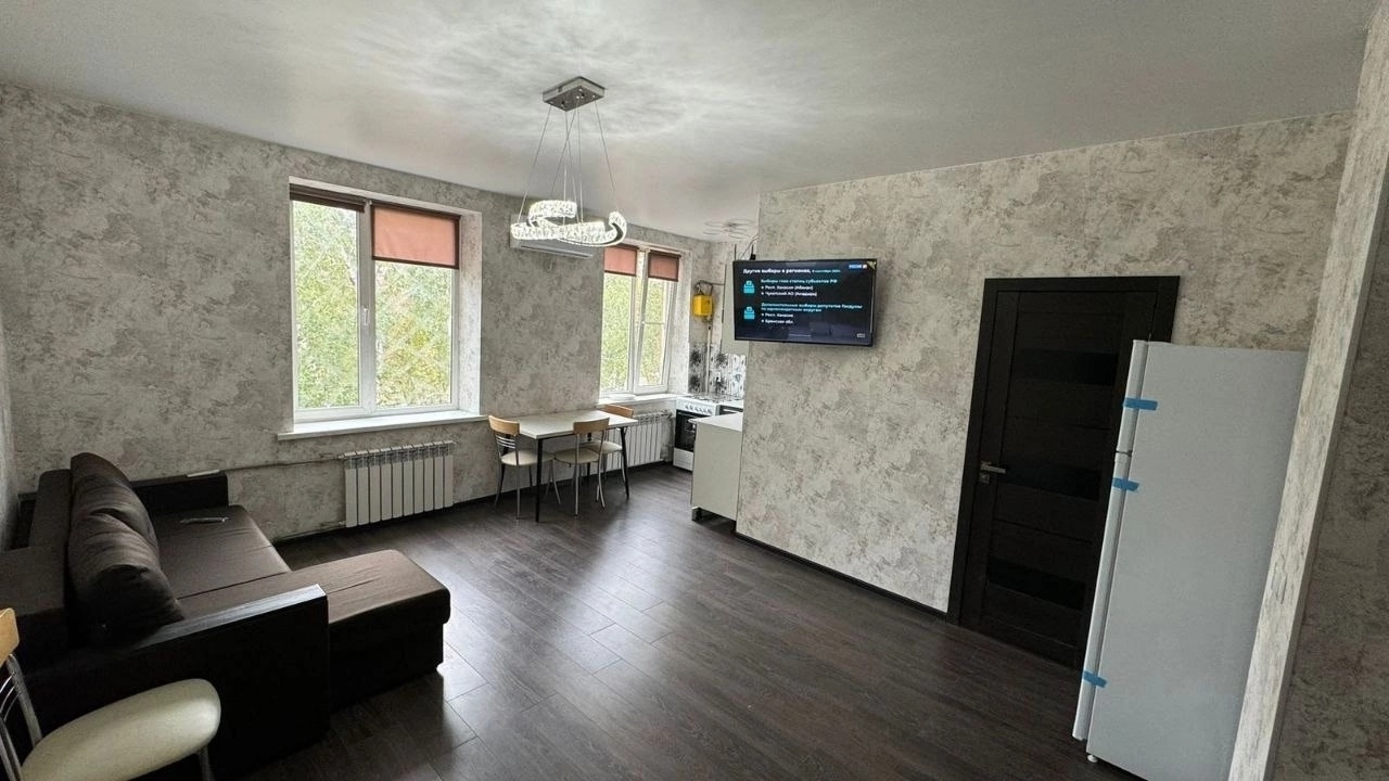 Зал студия и отдельная комната, сан.уз. совмещён. Мебель новая, техника — новая. Только после капитального ремонта. Все коммуникации заменены, счётчики на все. Цена 2.500.000 рублей + ан.